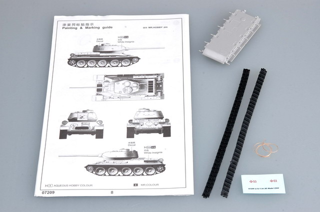 The T-34/85 was a modification of the T-34 equipped with a more powerful armor and cannon. T-34/85 had a flatter turret which gave this already inovative tank design the look that all tanks adopted after the wars end. Although not equal to the German Panther and Tiger tanks, the huge numbers of T-34s more than compensated for their technological shortcomings. Item No 07209 Item Name Soviet T-34/85 MOD.1944 Bar Code 9580208072098 Scale 1/72 Item Type Static Armor Model Brief Length:138.4 mm Width:62.6 mm Height:57.4 mm Total Parts 82pcs Film Parts n/a Total Sprues 5pcs+tracks Paint Schemes SOVIET ARMY Released Date n/a More Features n/a