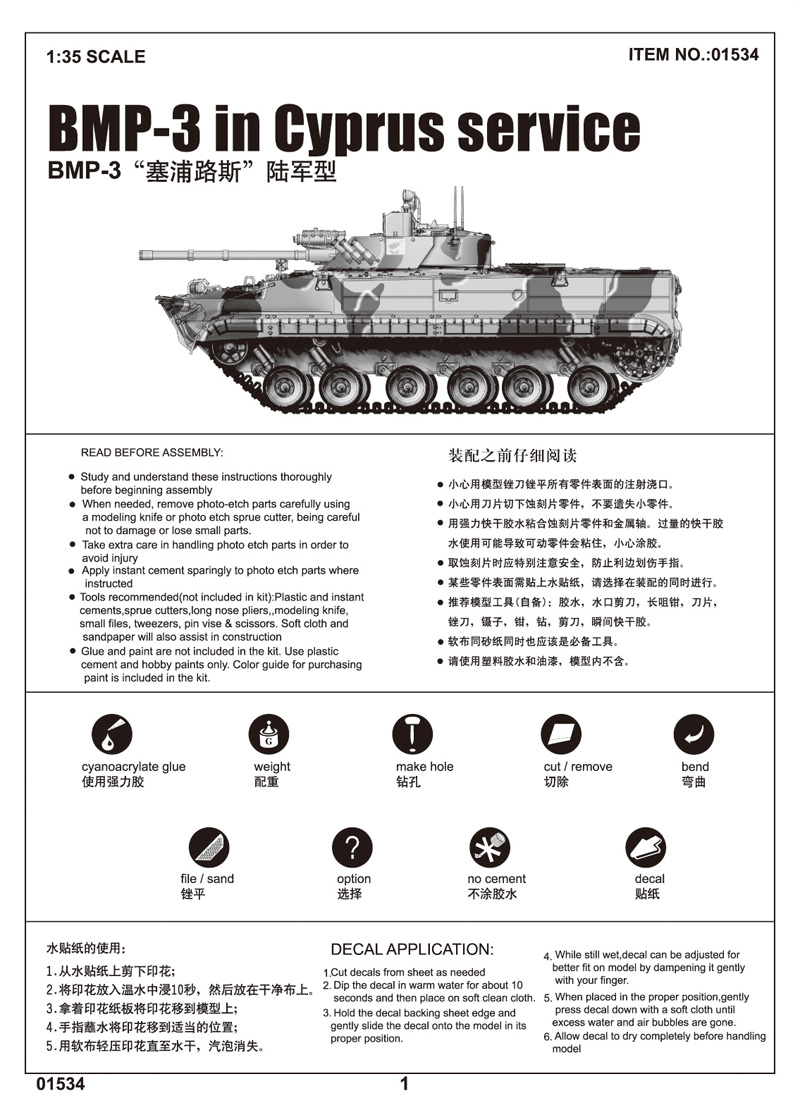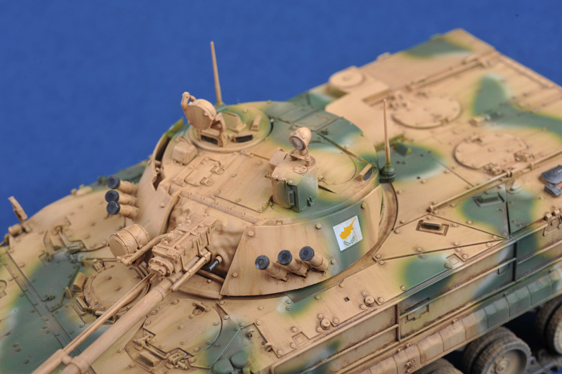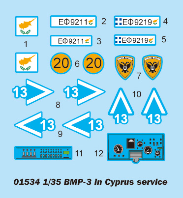 The BMP-3 is the latest in the long line of BMP series IFVs following the BMP-1 and BMP-2. The power pack sits to the rear-right with fuel tank in the hull. The seating area for 7 combat-ready troops is also located in the rear complete with roof hatches. Two doors at the extreme rear of the hull allow horizontal access for dismounting troops. Steps are also provided for easy entry/exit to compensate for the BMP-3's above average ground clearance. The BMP-3 infantry combat vehicle entered production in the late 1980s. It is in service with the Russia Army and over 600 have been exported to a number of countries, including United Arab Emirates (390 vehicles), Cyprus, Kuwait (110) and South Korea. Item No 01534 Item Name BMP-3 in Cyprus service Bar Code 9580208015347 Scale 1:35 Item Type Static Kit Model Brief Length: 203mm Width: 95mm Total Parts 740+ Metal Parts n/a Photo Etched Parts 1 piece Film Parts n/a Resin Parts n/a Total Sprues 11 sprues, upper hull,lower hull,turret and tracks Paint Schemes Cyprus Army Released Date 2012-10 More Features "The kit consists of over 740 parts , includes 5 clear parts. >the kit w/refined detail >multi-slide moulded lower hull , upper hull & turret >192 individual tracks links >photo-etched parts included"